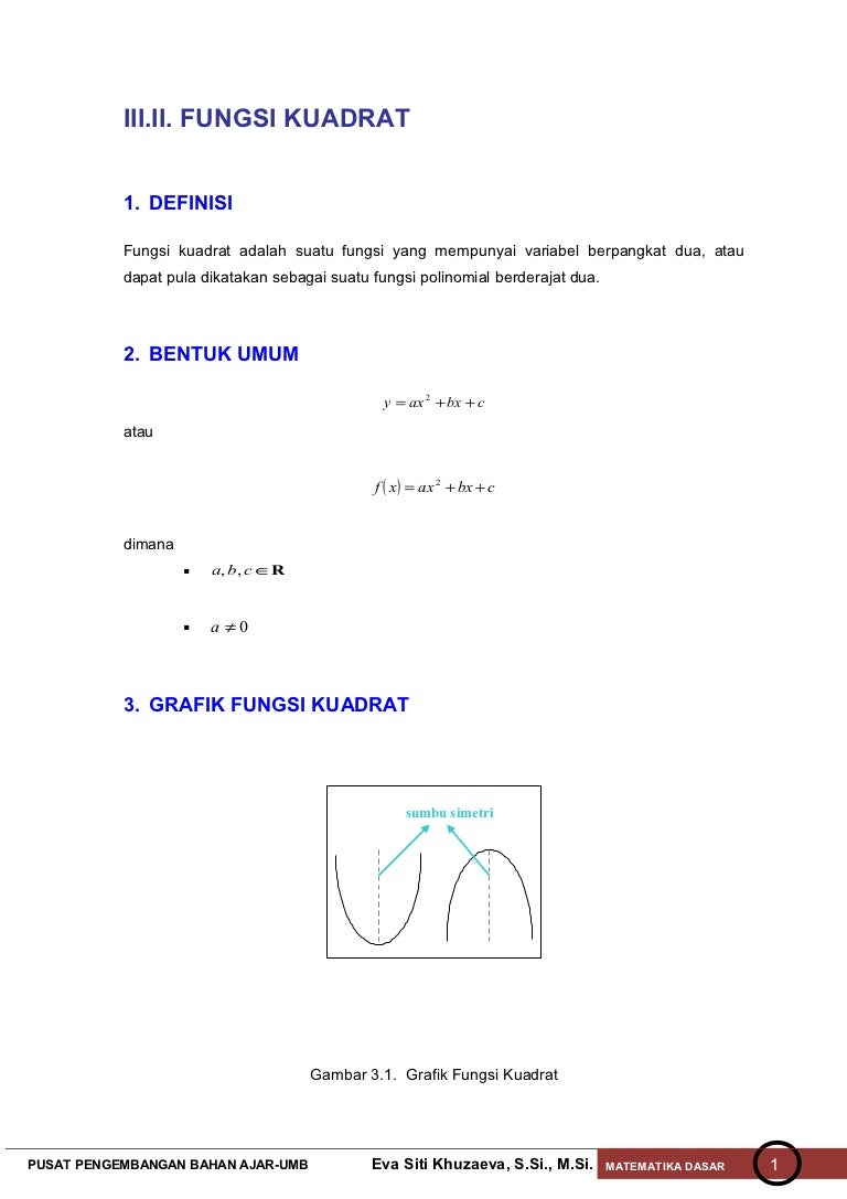Persamaan Kuadrat from image.slidesharecdn.com Bilangan kuadrat adalah sebuah bilangan positif yang di dapat dari hasil perkalian suatu bilangan tertentu contoh soal 1 : Secara umum fungsi kuadrat memiliki bentuk umum seperti berikut ini Bentuk umum dari persamaan kuadrat atau pk adalah sebagai berikut Kalian sudah tau, persamaan kuadrat ialah sebuah persamaan dari variable yang mempunyai pangkat tertinggi dua. Umumnya, materi ini dipelajari setelah siswa memahami konsep mengenai persamaan kuadrat. Atau 22 maka hasilnya 2 x 2 = 4. Pengertian kuadrat adalah perkalian suatu bilangan dari bilangan itu sendiri. Fungsi kuadrat dapat digambarkan ke dalam koordinat kartesius sehingga diperoleh suatu grafik fungsi kuadrat.