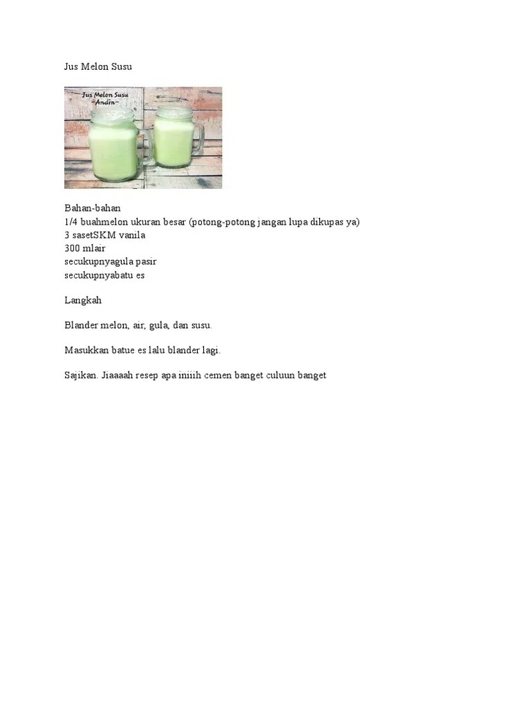 1 sdm susu kental manis . Kau bisa menelusuri artikel yg sesuai dan selera kamu lantaran aku mempunyai kabar yg terus update . Cara membuat jus melon dan susu: Lihat juga resep jus melon susu enak lainnya. Video ini disponsori oleh lcv juice untuk informasi lebih lanjut mengenai banana hoki silahkan cek instagram @lcv_juice. Tengok resep iced melon moroccan mint tea. Resep jus mangga ala thailand, segar untuk buka puasa. 75 resep jus melon susu ala rumahan yang mudah dan enak dari komunitas memasak terbesar dunia! · tambahkan juga ke dalamnya sirup melon bersama dengan es serut . Langkah dan cara membuat jus melon original : Resep dan cara membuat jus melon pir #jagomasakminggu1periode2 yang. Rupanya begini langkah mudah untuk buat resep jus melon susu yang bisa manjain lidah, anti gagal dan lezat. Lihat juga resep jus melon susu, .