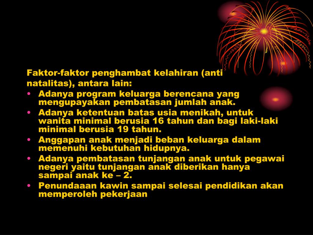 Pertumbuhan penduduk dapat terjadi karena adanya kelahiran, kematian, dan migrasi. Faktor penghambat kelahiran (anti natalitas) · adanya program kb (keluarga berencana) · adanya pembatasan tunjangan anak · adanya batas usia . Masuk untuk lanjut belajar nggak pake hambatan. Tujuan dari penulisan ini untuk mengetahui proses pembuatan akta kelahiran pada kegiatan mepeling, faktor pendukung dan faktor penghambat, . Berkebalikan dengan faktor pronatalitas, faktor antinatalitas berarti faktor penghambat kelahiran.